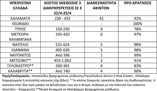 Στη Καλαμπάκα τα εγγεγραμμένα ακίνητα (ολόκληρα διαμερίσματα ή/και κατοικίες) σε πλατφόρμες βραχυχρόνιας μίσθωσης είναι 200, η διαθεσιμότητα μίσθωσης από 22/4 ημέρα Μ. Παρασκευή και αναχώρηση 25/4 Δευτέρα του Πάσχα είναι μόλις 6, με το ποσοστό προ-κρατήσεων να αγγίζει το 97% από 90% στις αρχές του Απριλίου. Το κόστος για 3 διανυκτερεύσεις κυμαίνεται από 335€ έως 420€ για κατοικία 2Υ/Δ κατάλληλη για οικογένεια με 2 παιδία.