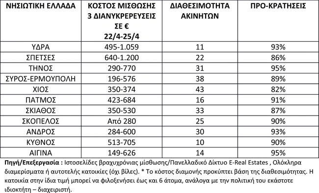Η δυναμικότητα του νησιού σε πλατφόρμες βραχυχρόνιας μίσθωσης είναι 108 κατοικίες. Το ποσοστό προ-κρατήσεων αγγίζει πλέον το 90% και τα διαθέσιμα ακίνητα για το τριήμερο είναι 10. Το κόστος μίσθωσης για το τριήμερο του Πάσχα κυμαίνεται από 513€ έως 705€.