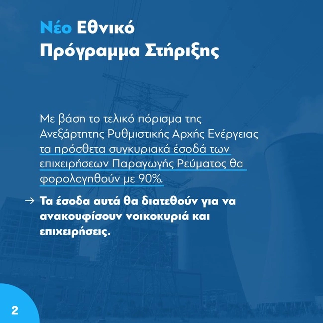 Επίσης, ο πρωθυπουργός πρόσθεσε ότι οι επιχειρήσεις παραγωγής ρεύματος θα κληθούν να καταβάλουν το δικό τους μέρισμα αλληλεγγύης στην κοινωνία, που δοκιμάζεται από την ακρίβεια. «Με βάση, λοιπόν, το τελικό πόρισμα της Ανεξάρτητης Ρυθμιστικής Αρχής Ενέργειας, που αναμένεται τις αμέσως επόμενες μέρες, τα πρόσθετα συγκυριακά έσοδά τους θα φορολογηθούν με ένα ειδικό τέλος ύψους 90%» είπε.