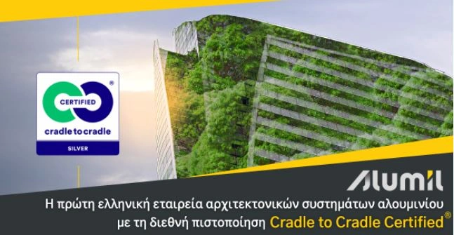 Επειτα από σημαντικές επενδύσεις στην παραγωγή «πράσινου» ανακυκλωμένου αλουμινίου, τα EPD (Περιβαλλοντικές Δηλώσεις Προϊόντων) για ολοκληρωμένα αρχιτεκτονικά συστήματα και την τιμητική διάκριση “Most Sustainable Company in Greece 2022” ως επιχείρηση – πρότυπο του βιώσιμου μοντέλου ανάπτυξης, η ALUMIL γίνεται η πρώτη ελληνική εταιρεία αρχιτεκτονικών συστημάτων αλουμινίου που λαμβάνει τη διεθνή πιστοποίηση Cradle to Cradle Certified® (C2C) Silver για μια μεγάλη γκάμα προϊόντων, επικυρώνοντας τη βιωσιμότητά τους.