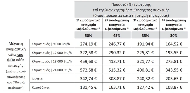 Οι παραπάνω τιμές αντιστοιχούν σε καθαρή αξία λιανικής πώλησης προ ΦΠΑ. Σημειώνεται ότι ο ΦΠΑ είναι επιλέξιμος και ενισχύεται κατά το ίδιο ποσοστό (αναλόγως της εισοδηματικής κατηγορίας), όμως δεν συνυπολογίζεται στο απόλυτο ανώτατο όριο, ώστε να προστίθεται διακριτά ο ΦΠΑ της κάθε περιοχής στην οποία εμπίπτει ο προμηθευτής που διενεργεί τη συναλλαγή.