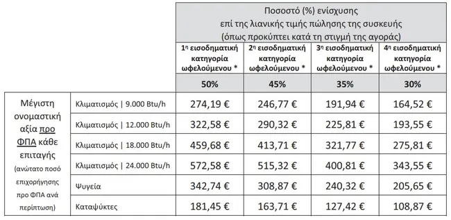 Μέσω του προγράμματος επιδοτείται ποσοστό (%) της δαπάνης αγοράς κάθε νέας συσκευής. Συγκεκριμένα, κάθε δικαιούχος λαμβάνει ισάριθμες επιταγές (vouchers), ανάλογα με τις συσκευές που θα επιλέξει, τις οποίες μπορεί να εξαργυρώσει σε προμηθευτή της επιλογής του, μειώνοντας το τελικό ποσό που θα κληθεί να καταβάλει για την αγορά τους. Ο Φορέας Πιστοποίησης και Πληρωμής του προγράμματος καταβάλλει την αξία των επιταγών απευθείας στον προμηθευτή, σε χρόνο που έπεται της ολοκλήρωσης της συναλλαγής. Η τελική αξία της κάθε επιταγής εξαρτάται από την κατηγορία του ωφελούμενου, τα χαρακτηριστικά της αντίστοιχης συσκευής, καθώς και την τιμή αγοράς της, και καθορίζεται σύμφωνα με τον ακόλουθο πίνακα: