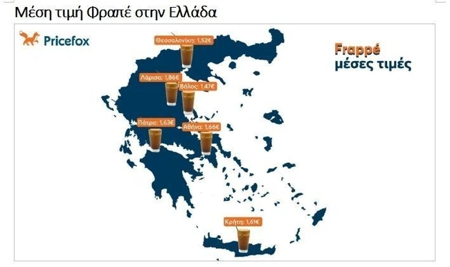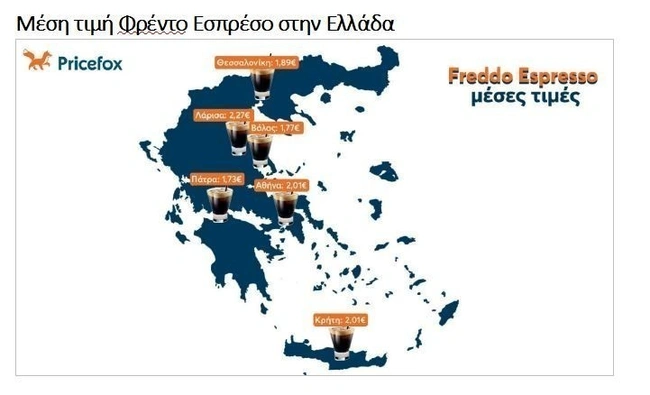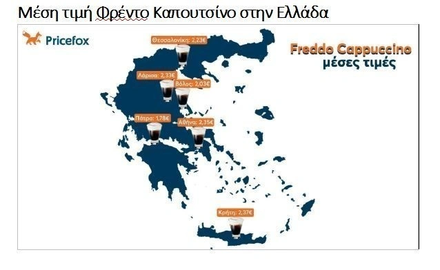Ακριβά πληρώνουν Κρητικοί και τουρίστες τον φρέντο καπουτσίνο στην Κρήτη καθώς το συγκεκριμένο είδος καφέ έχει την πιο ακριβή μέση τιμή σε όλη την Ελλάδα, στα 2,37 ευρώ με τον ακριβότερο να πλησιάζει τιμές Κολωνακίου στα 3,5 ευρώ. Μετά την Λάρισα, η Κρήτη μαζί με την Αθήνα έχει τον ακριβότερο φρέντο επσρέσο με μέση τιμή 1,63 ευρώ.