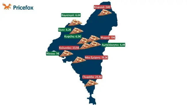 Σύμφωνα με την έρευνα στην Αττική, μέση τιμή έχει εδραιωθεί πλέον στα 9,8 ευρώ. Η πιο ακριβή πίτσα φιγουράρει στα 25.8 ευρώ στη Γλυφάδα. Την πεντάδα τις ακρίβειας συμπληρώνουν στην Αττική η Κηφισιά με μέγιστη τιμή στα 24 ευρώ, το Κολωνάκι στα 23.5 ευρώ, η Νέα Σμύρνη στα 19.3 ευρώ και το Ψυχικό στα 19 ευρώ (μέγιστες τιμές). Τις πιο φθηνές πίτσες μπορεί κανείς να βρει στις περιοχές Αιγάλεω, Περιστέρι, Καλλιθέα, Πειραιά και Νίκαια από περίπου 5 ευρώ.