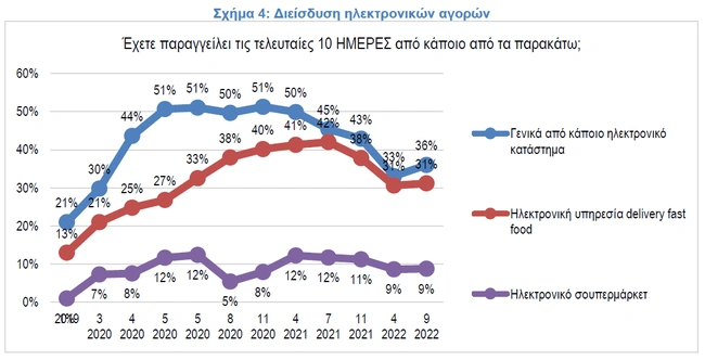 Τέλος, οι ηλεκτρονικές αγορές εμφανίζουν μία μικρή κάμψη το τελευταίο διάστημα, η οποία αποδίδεται εν μέρει σε διόρθωση ύστερα από τις πολύ μεγάλες αυξήσεις του 2020 και εν μέρει στην τάση αναβολής αγορών και στην εν γένει μείωση του όγκου αγορών το τελευταίο εξάμηνο, Πρακτικά μετά την ιδιαίτερα απότομη αύξηση των ηλεκτρονικών πωλήσεων λόγω της πανδημίας και ειδικά των απαγορευτικών, η οποία ανέβασε τη διείσδυση των ηλεκτρονικών αγορών (δηλαδή τις τελευταίες 10 ημέρες) στο 50% γενικά και στο 12% για τα είδη παντοπωλείου, η περίοδος 2021-2022 έφερε μία σταδιακή διόρθωση σε ποσοστά 36% και 9% αντίστοιχα.