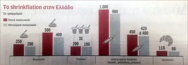 Χαρακτηριστικό είναι το παράδειγμα που φέρνει η εφημερίδα Καθημερινή που αναδεικνύει το θέμα. Στέκεται σε μία συγκεκριμένη μάρκα μαργαρίνης, ίσως την πιο γνωστή, όπως αναφέρει της αγοράς, που συνεχίζει να κυκλοφορεί στο ίδιο μέγεθος συσκευασίας, ωστόσο το προϊόν που έχει μέσα είναι πολύ λιγότερο, αλλά αναγράφει πως για παράδειγμα περιέχει 400 γρ. προϊόντος και όχι 500 γρ. που είχε μέχρι πρόσφατα. Οπως αναφέρει η έρευνα την 1η Μαρτίου, λίγες ημέρεs αφού είχε ξεσπάσει ο πόλεμοs στην Ουκρανία, n μέσn τιμή τnς εν λόγω μαργαρivns (συσκευασία των 250 γρ.) ήταν 1,41 ευρώ. Σήμερα n συσκευασία των 200 γρ. πωλείται προs 1,62 ευρώ. Δηλαδή ο καταναλωτήs πληρώνει 21λεπτά περισσότερα ή 15% ακριβότερα μία συσκευασία που περιέχει 50 γρ. λιγότερο προϊόν. Σε ό,τι αφορά την τιμή ανά κιλό, αυτή έχει αυξηθεί από 5,64 ευρώ σε 8,1 ευρώ, δηλαδή κατά 43,61%!