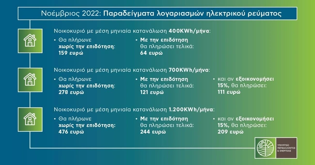 Ενα νοικοκυριό με μηνιαία κατανάλωση 400 κιλοβατωρών θα πλήρωνε χωρίς την επιδότηση 159 ευρώ ενώ μετά την επιδότηση θα πληρώσει 64 ευρώ (εξοικονόμηση 59,7 %).