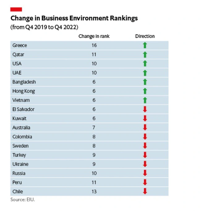 Ρεκόρ στη βελτίωση του επιχειρηματικού περιβάλλοντος τα τελευταία τρία χρόνια καταγράφει η Ελλάδα σύμφωνα με την κατάταξη (BERs) της EIU για το τέταρτο τρίμηνο του 2022. Σε σύγκριση με το τέταρτο τρίμηνο του 2019, η κατάταξη της Ελλάδας αυξήθηκε κατά 16 θέσεις ως αποτέλεσμα όπως αναφέρεται μιας κυβερνητικής πολιτικής που έχει αναλάβει μεταρρυθμίσεις, μειώσεις φόρων και αποκατέστησε την εμπιστοσύνη στη χώρα.