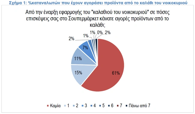 Οπως αναφέρει η έρευνα, ένα από τα σημαντικότερα θέματα της επικαιρότητας είναι η νέα πρωτοβουλία του Υπουργείο Ανάπτυξης και Επενδύσεων και των Αλυσίδων σουπερμάρκετ για το «καλάθι του νοικοκυριού». Όπως καταγράφεται στο σχήμα 1, το πρώτο 10ήμερο της λειτουργίας αυτής της πρωτοβουλίας, το 39% του κοινού δηλώνει ότι αγόρασε έστω μία φορά κάποιο προϊόν από το καλάθι. Το 15% έχει πραγματοποιήσει 1 επίσκεψη, το 11% 2 επισκέψεις, το 7% 3 επισκέψεις και το υπόλοιπο 6% 4 επισκέψεις ή περισσότερες. Τα στοιχεία δείχνουν ότι αν και η πλειοψηφία του κοινού δεν έχει αγοράσει κάποιο προϊόν από το καλάθι, ένα αρκετά μεγάλο ποσοστό έχει προσεγγίσει τουλάχιστον δοκιμαστικά την πρωτοβουλία τις πρώτες 7-10 ημέρες που υλοποιείται. Άρα αναμένεται αυτά τα ποσοστά να αυξηθούν στο μέλλον.