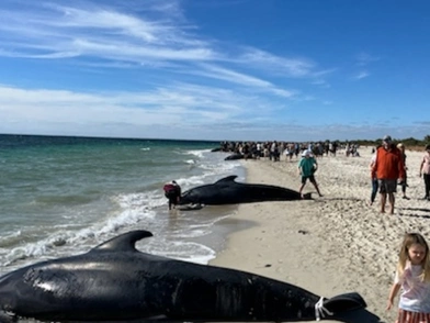 Ομάδες διάσωσης έσπευσαν στην παραλία που βρίσκεται στην παραθαλάσσια πόλη Ντάνσμπορο, νότια του Περθ, για να περιθάλψουν τις φάλαινες.