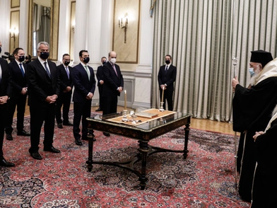 Η ορκωμοσία των νέων Υπουργών και Υφυπουργών πραγματοποιείται σε τρεις ομάδες, λόγω των περιοριστικών μέτρων για την αντιμετώπιση της πανδημίας. Τα μέτρα για τον περιορισμό της διασποράς του κορονοϊού στην ορκωμοσία είναι αυστηρά. Όσοι ορκίζονται υποβάλλονται σε rapid test.