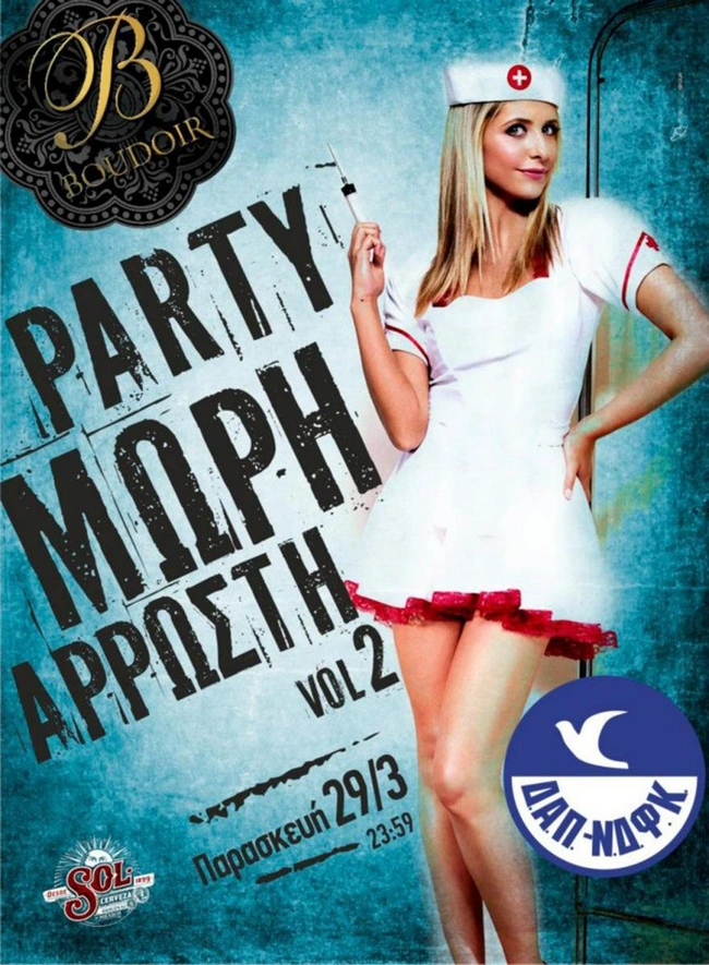 «Μια και μιλάμε για αρχές και για αναβάθμιση του Πανεπιστημίου, έχω εδώ τη δική σας ιδεολογική σύγκρουση στα πανεπιστημία. Τα πάρτι της ΔΑΠ – ΝΔΦΚ. Θα τα καταθέσω στα πρακτικά να υπάρχουν στην ιστορία. Ορίστε, ημίγυμνη, πάρ' τη με 6 ευρώ.