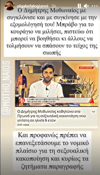 «Ο Δημήτρης Μοθωναίος με συγκλόνισε και με συγκίνησε με την εξομολόγησή του. Μπράβο για το κουράγιο του να μιλήσει, πιστεύω ότι μπορεί να βοηθήσει κι άλλους, να τολμήσουν να σπάσουν το τείχος της σιωπής. Και προφανώς πρέπει να επανεξετάσουμε το νομικό πλαίσιο για τη σεξουαλική κακοποίηση και κυρίως τα ζητήματα παραγραφής», αναφέρει η Όλγα Κεφαλογιάννη.