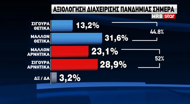 Αναφορικά με τη διαχείριση της πανδημίας,το 52% των ερωτηθέντων δεν είναι ικανοποιημένο με το πώς η κυβέρνηση έχει διαχειριστεί την πανδημία. Το 13,25% την αξιολογεί «σίγουρα θετικά» και το 31,6% «μάλλον θετικά».