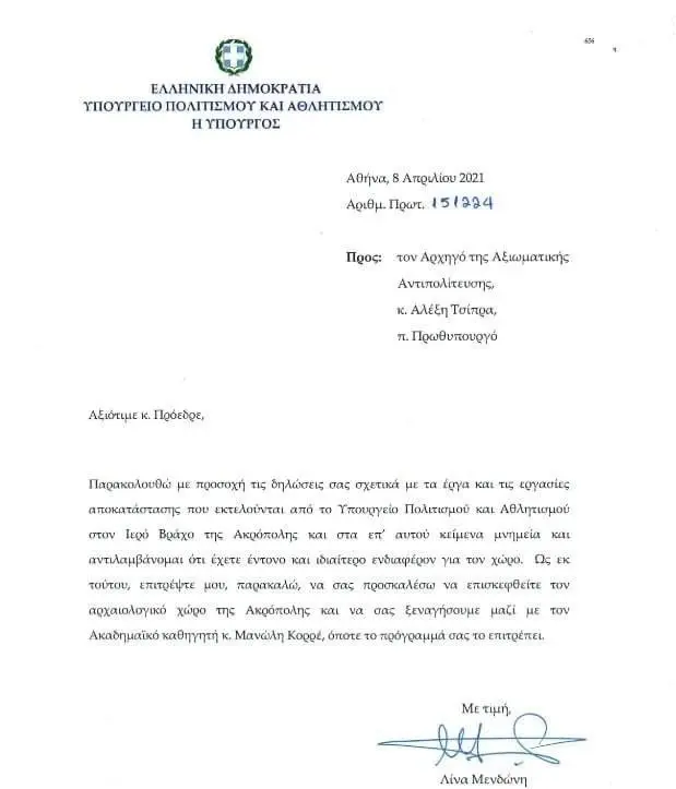 Παρακολουθώ με προσοχή τις δηλώσεις σας σχετικά με τα έργα και τις εργασίες αποκατάστασης που εκτελούνται από το υπουργείο Πολιτισμού και Αθλητισμού στον Ιερό Βράχο της Ακρόπολης και στα επ’ αυτού κείμενα μνημεία και αντιλαμβάνομαι ότι έχετε έντονο ενδιαφέρον για τον χώρο.
