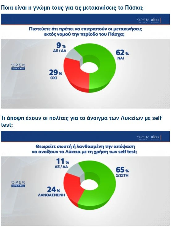 Αναφορικά με τις μετακινήσεις του Πάσχα, το 62% τάσσεται κατηγορηματικά υπέρ, ενώ το 29% εναντίον, ενώ το άνοιγμα των Λυκείων με σελφ τεστ βρίσκει σύμφωνο το 65% των ερωτηθέντων, δηλαδή τους 2 στους 3.