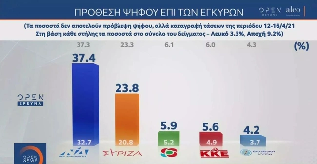 Ειδικότερα, στην πρόθεση ψήφου, τα κόμματα λαμβάνουν: ΝΔ: 37,4%, ΣΥΡΙΖΑ-ΠΣ: 23,8%, ΚΙΝΑΛ: 5,9%, ΚΚΕ: 5,6%, Ελληνική Λύση: 4,2%, ΜέΡΑ25: 2,9%, Πλεύση Ελευθερίας: 1,4%.