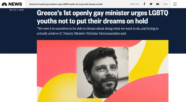 Με τίτλο «ο πρώτος ανοιχτά γκέι υφυπουργός της Ελλάδας προτρέπει τα νεαρά ΛΟΑΤΚΙ άτομα να μην βάζουν τα όνειρά τους σε αναμονή» το NBC δημοσιεύει ένα εκτενές προφίλ του αρμόδιου για τον σύγχρονο πολιτισμό υφυπουργού, αναφερόμενο στην επαγγελματική του πορεία, φιλοξενώντας και σχετικές δηλώσεις του.