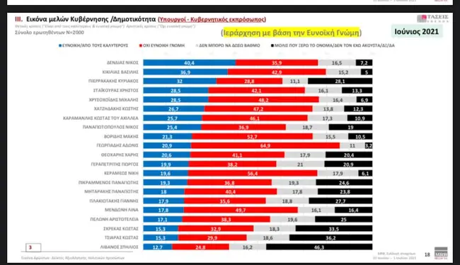 Νίκος Δένδιας και Βασίλης Κικίλιας σε μία ακόμη δημοσκόπηση, αυτή τη φορά από την MRB, είναι από τους πλέον δημοφιλείς υπουργούς της κυβέρνησης της Νέας Δημοκρατίας. Οπως μπορεί να δει κάποιος, ο υπουργός Εξωτερικών, Νίκος Δένδιας, στην ερώτηση για το αν ο κόσμος έχει ευνοϊκή γνώμη για εκείνον, λαμβάνει ποσοστό 40,4% ενώ ο υπουργός Υγείας, Βασίλης Κικίλιας θεωρείται από τους καλύτερους και έχει συγκεντρώσει 36,9%.