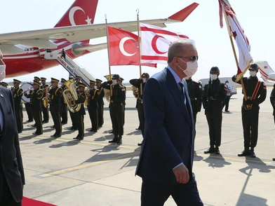 Ο Ερντογάν έφτασε στα κατεχόμενα, συνοδευόμενος από την σύζυγό του και δεκάδες μέλη της κυβέρνησης του, ενώ στην κουστωδία του, βρίσκονταν ακόμη ο εθνικιστής εταίρος του, Νταβλέτ Μπαχτσελί, βουλευτές του ΑΚΡ αλλά και οι αρχηγοί του Στρατού, του Ναυτικού και της Αεροπορίας. «Η ελληνική πλευρά προσποιείται ότι υπερασπίζεται μια ομοσπονδία για το νησί», «ωστόσο δεν θα περιμένουμε να περάσουν άλλα πενήντα χρόνια χωρίς μια κατάλληλη λύση», τόνισε ο Τούρκος πρόεδρος.