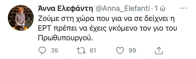 Είχε προηγηθεί η ανάρτηση της Αννας Ελεφαντή στο twitter η οποία αναφέρει: «Ζούμε στη χώρα που για να σε δείχνει η ΕΡΤ πρέπει να έχεις γκόμενο τον γιο του Πρωθυπουργού».