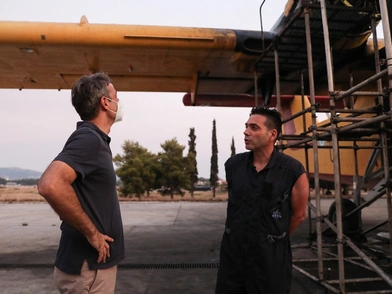 Ο πρωθυπουργός ευχαρίστησε θερμά τους χειριστές για τον αγώνα που δίνουν αδιάκοπα τις τελευταίες ημέρες με τις πυρκαγιές σε όλη τη χώρα, κάνοντας ρίψεις νερού μέσα από τους καπνούς και σε πολύ κοντινή απόσταση από τις φλόγες, και τους μηχανικούς που φροντίζουν ακόμη και κατά τη διάρκεια της νύχτας για την πτητική ικανότητα των αεροσκαφών.