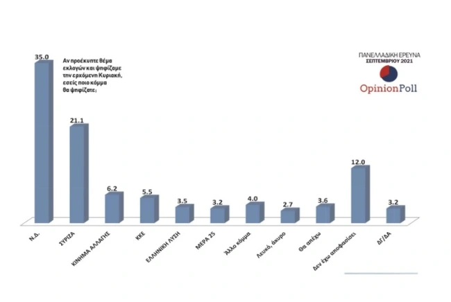 Αν και τα μέτωπα της κυβέρνησης το τελευταίο χρονικό διάστημα ήταν πολλά δημοσκόπηση δείχνει ότι η Νέα Δημοκρατία και ο Κυριάκος Μητσοτάκης κρατάνε σταθερό προβάδισμα προτίμησης έναντι των πολιτικών αντιπάλων τους. Το «καυτό» καλοκαίρι ελέω πυρκαγιών αλλά και πανδημίας κορονοϊού που έχει φέρει πολλές συγκρούσεις με πολλούς κλάδους λόγω της υποχρεωτικότητας του εμβολιασμού, δεν έχουν επηρρεάσει την αποδοχή των κυβερνητικών αποφάσεων.