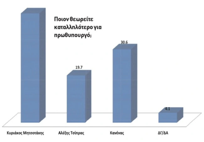 Παράλληλα αδιαμφισβήτητη είναι η κυριαρχία του Κυριάκου Μητσοτάκη, αφού εμφανίζει ποσοστό καταλληλότητας για πρωθυπουργός 45,6% την ώρα που ο Αλέξης Τσίπρας «χάνει» από τον «Κανένα» με τον πρόεδρο του ΣΥΡΙΖΑ να συγκεντρώνει 19,7% έναντι 30,6% των πολιτών που δεν επιλέγουν κανέναν από τους δύο.