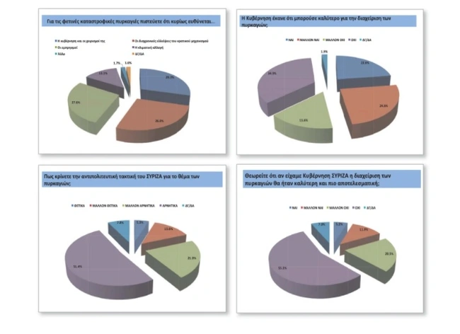H έρευνα αποτυπώνει και την άποψη του κόσμου για την διαχείριση των πυρκαγιών με το 29,7% να ρίχνει την ευθύνη στην κυβέρνηση ενώ το 27,6% στους εμπρησμούς. Την ίδια ώρα αρνητική είναι η άποψη των πολιτών, σε ποσοστό 51,4% για την αντιπολιτευτική πολιτική του ΣΥΡΙΖΑ στο συγκεκριμένο θέμα.