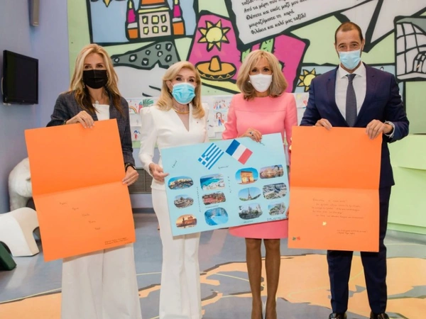 Τα παιδιά της Ογκολογικής Μονάδας είχαν ετοιμάσει χειροτεχνίες για τις δύο κυρίες αφιερωμένες στη διαχρονική φιλία ανάμεσα στην Ελλάδα και τη Γαλλία, τις οποίες τους παρέδωσε εκ μέρους των παιδιών η κυρία Βαρδινογιάννη.