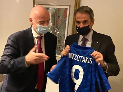 Ο Τζιάνι Ινφαντίνο δώρισε στον Έλληνα Πρωθυπουργό μία φανέλα της παγκόσμιας Ομοσπονδίας ποδοσφαίρου με το όνομά του και τον αριθμό 9 καθώς και ένα σετ με κάρτες που χρησιμοποιούν οι διαιτητές. Από την πλευρά του ο κ. Μητσοτάκης του προσέφερε ένα συλλεκτικό ρολόι για τα 200 χρόνια από την Ελληνική Επανάσταση.