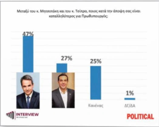 Στην έρευνα αποτυπώνεται επίσης η κυριαρχία του Κυριάκου Μητσοτάκη επί του Αλέξη Τσίπρα, καθώς θεωρείται από τους πολίτες με ποσοστό 41% ως ο καταλληλότερος για πρωθυπουργός.