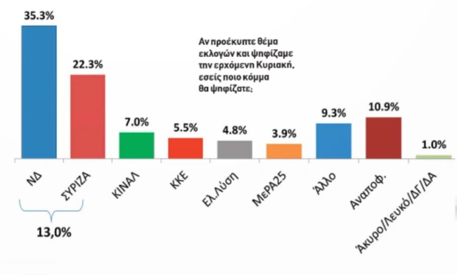 Με διαφορά που φτάνει το13% προηγείται η Νέα Δημοκρατία έναντι του ΣΥΡΙΖΑ σύμφωνα με μια νέα δημοσκόπηση, η οποία πραγματοποιήθηκε από την εταιρεία Interview. Σύμφωνα με την έρευνα η οποία διενεργήθηκε για την εφημερίδα Political, η διαφορά της ΝΔ από τον ΣΥΡΙΖΑ στην πρόθεση ψήφου είναι στο 13%. H δημοσκόπηση βασίστηκε σε τρία βασικά θέματα, τα οποία απασχόλησαν την επικαιρότητα κατά τη διάρκεια της διενέργειας της έρευνας. Η επιστροφή στην κανονικότητα για τους εμβολιασμένους, η ελληνογαλλική αμυντική συμφωνία και οι τιμές της ενέργειας.