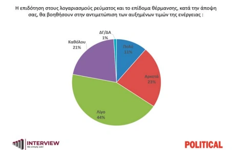 Περίπου ένα 33% πιστεύει ότι η επιδότηση στους λογαριασμούς ρεύματος και το επίδομα θέρμανσης θα βοηθήσουν τα νοικοκυριά να ανταπεξέλθουν στις απαιτήσεις της χειμερινής περιόδου. Αν και ακόμη οι αυξήσεις δεν έχουν γίνει αισθητές στους λογαριασμούς των καταναλωτών, δεν είναι λίγοι εκείνοι που εκφράζουν φόβο ότι με αυτές τις τιμές στο πετρέλαιο και το φυσικό αέριο η θέρμανση φέτος θα είναι μια δύσκολη υπόθεση. Και για αυτό περίπου έξι στους δέκα δείχνουν από καθόλου έως λίγο αισιόδοξοι για την πορεία της οικονομίας.
