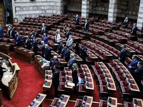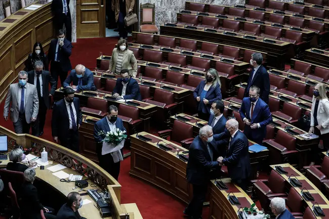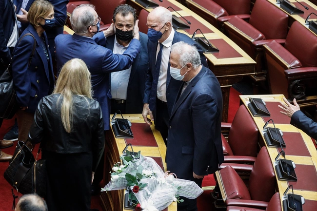 Εμφανώς συγκινημένος ο Βασίλης Κεγκέρογλου κρατούσε με τα δύο του χέρια το πρόσωπό του, προτού ξεσπάσει σε δάκρυα. Ο πρόεδρος της Βουλής, Κώστας Τασούλας, άφησε ένα μπουκέτο λευκά λουλούδια στο έδρανο της Φώφης Γεννηματά και κάθισε σκυθρωπός στη θέση του.