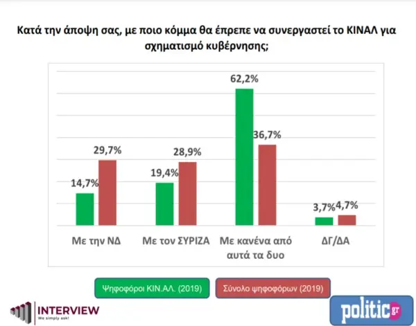 Η δημοσκόπηση καταγράφει τη σαφή θέση των ψηφοφόρων του ΚΙΝΑΛ για αυτόνομη πλεύση του κόμματος. Συγκεκριμένα, το 62,2% απαντά ότι δεν επιθυμεί καμιά συνεργασία με τα άλλα δύο μεγάλα κόμματα ΝΔ και ΣΥΡΙΖΑ. Το 29,7 % είναι θετικά διακείμενο με μια συνεργασία με την ΝΔ και το 28,9% τάσσεται υπέρ της συνεργασίας με το ΣΥΡΙΖΑ.