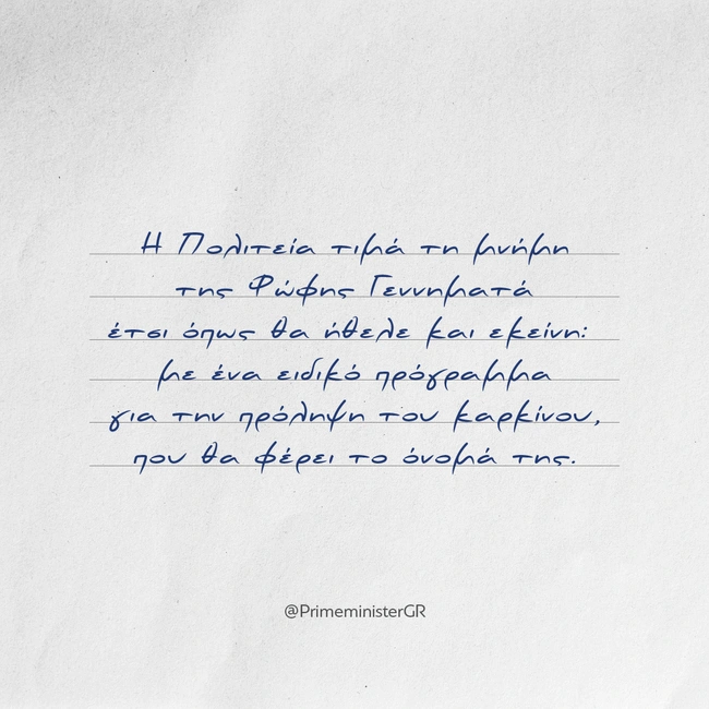 Οπως ακριβώς είχε προαναγγείλει μιλώντας σε Ελληνες δημοσιογράφους στο Ριάντ, ο πρωθυπουργός Κυριάκος Μητσοτάκης, δημοσίευσε επιστολή του με χειρόγραφο πρόλογο, όπου αναφέρει πως το νέο ειδικό πρόγραμμα που θα λειτουργήσει στη χώρα εντός του 2022 για την πρόληψη του καρκίνου του μαστού, θα φέρει το όνομα της Φώφης Γεννηματά. Ο πρωθυπουργός ήταν βαθιά θλιμμένος από την απώλεια της πρόεδρου του ΚΙΝΑΛ, η οποία έχασε τη ζωή της από την ασθένεια αυτή.