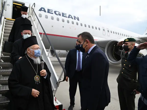 «Λίγο πριν τις 12 το μεσημέρι έφθασε στον Διεθνή Αερολιμένα Αθηνών, με τακτική πτήση από την Πόλη, η Α.Θ. Παναγιότης ο Οικουμενικός Πατριάρχης κ.κ. Βαρθολομαίος, ο οποίος θα πραγματοποιήσει εξαήμερη επίσημη επίσκεψη στην Αθήνα. Τον Παναγιώτατο υποδέχθηκαν ο Σεβ. Μητροπολίτης Σάμου κ. Ευσέβιος, εκ μέρους της Ιεράς Συνόδου της Εκκλησίας της Ελλάδος, και ο Εξοχ. Υπουργός Εθνικής Άμυνας της Ελλάδος κ. Ν. Παναγιωτόπουλος, εκ μέρους της Ελληνικής Κυβερνήσεως, ενώ του αποδόθηκαν τιμές από άγημα της Πολεμικής Αεροπορίας. Τον καλωσόρισαν, επίσης, ο επιχώριος Μητροπολίτης Μεσογαίας και Λαυρεωτικής κ. Νικόλαος, ο Σεβ. Μητροπολίτης Αδριανουπόλεως κ. Αμφιλόχιος, Διευθυντής του Γραφείου Εκπροσωπήσεως του Οικουμενικού Πατριαρχείου στην Αθήνα, ο Θεοφιλ. Επίσκοπος Ορεών κ. Φιλόθεος, Αρχιγραμματέας Ιεράς Συνόδου της Εκκλησίας της Ελλάδος, μαζί με στελέχη της Ι.Συνόδου, κληρικοί και άλλοι παράγοντες», αναφέρει το Πατριαρχείο.