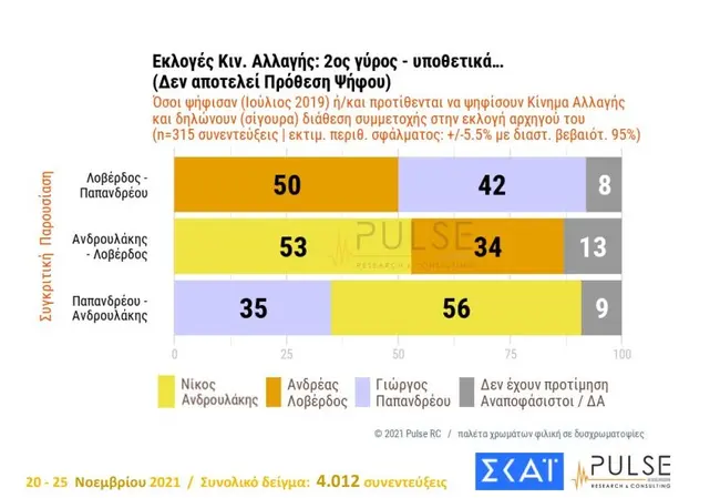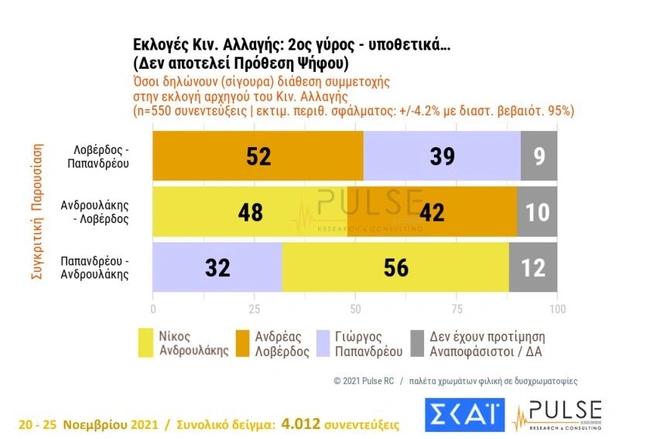 Σε θρίλερ εξελίσσονται οι εσωκομματικές εκλογές του Κινήματος Αλλαγής για την ανάδειξη νέου προέδρου, σύμφωνα με τη δημοσκόπηση του ΣΚΑΪ και της Pulse. Η μάχη, όπως φαίνεται από τη δημοσκόπηση, θα δοθεί ανάμεσα στους Ανδρέα Λοβέρδο, Νίκο Ανδρουλάκη και Γιώργο Παπανδρέου.