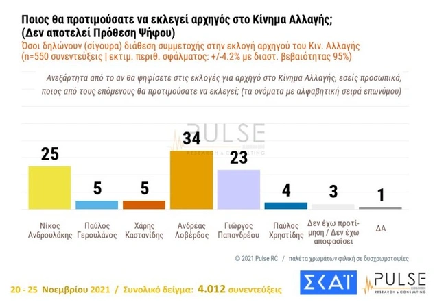 Στο ερώτημα «ποιος θα προτιμούσατε να εκλεγεί αρχηγός του ΚΙΝΑΛ» από όσους δηλώνουν διάθεση συμμετοχής στις εσωκομματικές εκλογές, το 34% «ψηφίζει» τον Ανδρέα Λοβέρδο, το 25% τον Νίκο Ανδρουλάκη, 23% τον Γιώργο Παπανδρέου, από 5% αντίστοιχα τον Παύλο Γερουλάνο και τον Χάρη Καστανίδη και 4% τον Παύλο Χρηστίδη. Ωστόσο, υπάρχει ένα περιθώριο σφάλματος της τάξεως του 4,2%.
