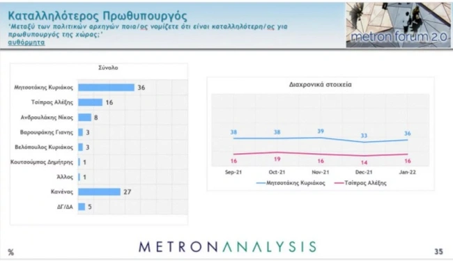 Καταλληλότερος για πρωθυπουργός αναδεικνύεται ο Κυριάκος Μητσοτάκης με 36%, ακολουθεί ο Αλέξης Τσίπρας με 16% και ο Νίκος Ανδρουλάκης με 8%.