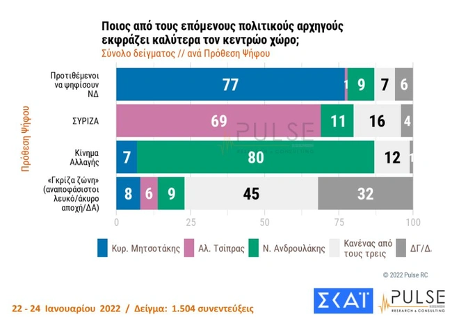 Στο ίδιο ερώτημα, ανά πρόθεση ψήφου, από αυτούς που προτίθενται να ψηφίσουν ΝΔ, το 77% σημείωνει ότι αυτός που εκφράζει καλύτερα τον κεντρώο χώρο είναι ο Κυριάκος Μητσοτάκης, το 9% ο Νίκος Ανδρουλάκης, το 7% «κανένας από τους τριες», το 6% δε γνωρίζει και μόλις το 1% σημειώνει ο Αλέξης Τσίπρας. Αντίστοιχα, στους ψηφοφόρους του ΣΥΡΙΖΑ, το 69% θεωρεί ότι αυτός που εκφράζει καλύτερα τον κεντρώο χώρο είναι ο Αλέξης Τσίπρας, το 11% ο Νίκος Ανδρουλάκης, το 16% κανέναν από τους τρεις και το 4% δεν απαντά.
