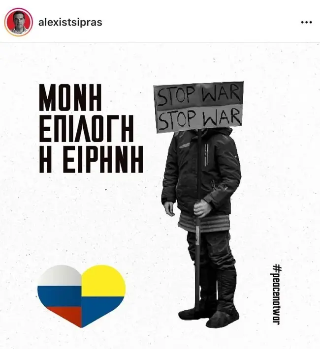 Με σύνθημα «Μόνη επιλογή η ειρήνη», ένα πανό που γράφει «No war» και ένα «απαγορευτικό» στις βόμβες, ο Αλέξης Τσίπρας τοποθετήθηκε σήμερα, με δύο αναρτήσεις για την ρωσική εισβολή στην Ουκρανία. Στην ανάρτησή του ο πρόεδρος του ΣΥΡΙΖΑ αναφέρει: Η πολεμική εισβολή της Ρωσικής Ομοσπονδίας στην Ουκρανία, οι σκηνές φρίκης που παρακολουθούμε από τους δέκτες της τηλεόρασής μας, οι βομβαρδισμοί, οι μάχες, ο θάνατος που σκορπά στους δρόμους μιας ευρωπαϊκής πρωτεύουσας, είναι πισωγύρισμα στις πιο φρικτές στιγμές της ιστορίας.