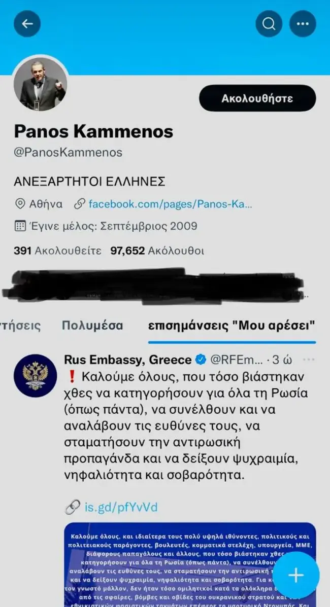 Ο πρώην υπουργός Αμυνας στην συγκυβέρνηση ΣΥΡΙΖΑ - ΑΝΕΛ, Πάνος Καμμένος, πάτησε like στην ανακοίνωση που έκανε η ρωσική πρεσβεία στην Ελλάδα. Πιο συγκεκριμένα, η ρωσική πρεσβεία στην Ελλάδα κατηγόρησε - με ανακοίνωσή της και σχετική ανάρτησή της στα social media - την κυβέρνηση για «αντιρωσική προπαγάνδα» στον πόλεμο της Ουκρανίας και αναφέρθηκε στα θύματα του Ντονμπάς. «Συνέλθετε», ήταν το επίμαχο μήνυμα που έστειλε η ρωσική πρεσβεία.