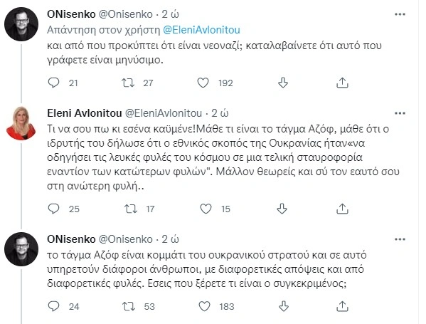 Η κυρία Αυλωνίτου του απάντησε: «Τι να σου πω κι εσένα καημένε! Μάθε τι είναι το τάγμα Αζόφ, μάθε ότι ο ιδρυτής του δήλωσε ότι ο εθνικός σκοπός της Ουκρανίας ήταν “να οδηγήσει τις λευκές φυλές του κόσμου σε μια τελική σταυροφορία εναντίον των κατώτερων φυλών". Μάλλον θεωρείς και σύ τον εαυτό σου στη ανώτερη φυλή». O Κώστας Ονισένκο απάντησε στην Ελένη Αυλωνίτου: «το τάγμα Αζόφ είναι κομμάτι του ουκρανικού στρατού και σε αυτό υπηρετούν διάφοροι άνθρωποι, με διαφορετικές απόψεις και από διαφορετικές φυλές. Εσείς που ξέρετε τι είναι ο συγκεκριμένος;».