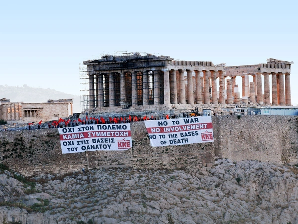 Αντιπολεμικά πανό κρέμασαν στον Βράχο της Ακρόπολης μέλη του ΚΚΕ στέλνοντας μήνυμα -τόσο στα ελληνικά όσο και στα αγγλικά- ενάντια στους πολέμους και στις «βάσεις του θανάτου» όπως χαρακτηριστικά σημειώνεται. Τα μέλη του Κομμουνιστικού Κόμματος ξεδίπλωσαν τα πανό το πρωί της Πέμπτης, στα τείχη του Βράχου με φόντο τον Παρθενώνα.