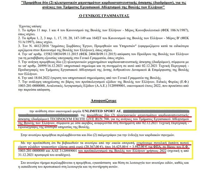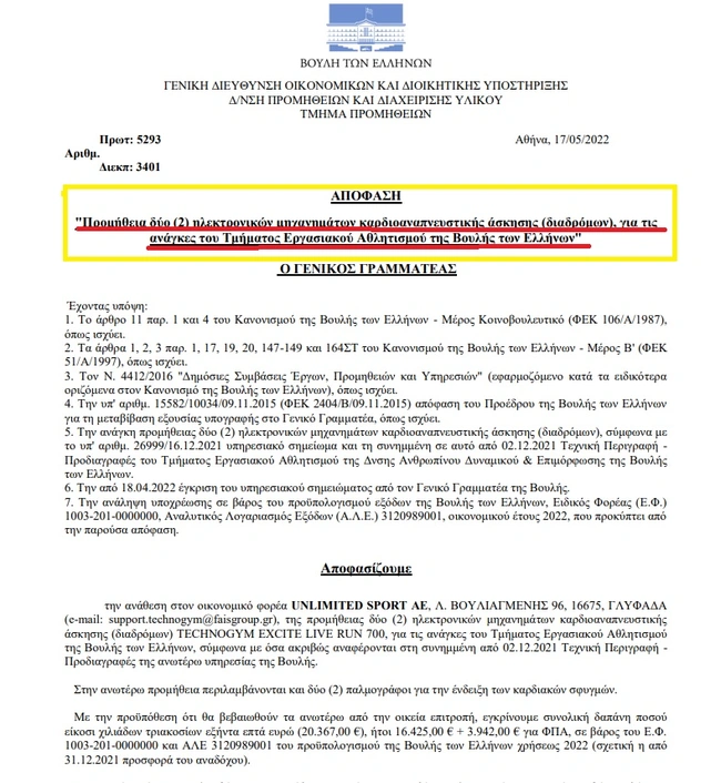 Συναρπαστικές προπονητικές εμπειρίες με τη βοήθεια της τεχνητής νοημοσύνης θα έχουν την ευκαιρία να δοκιμάσουν οι Ελληνες βουλευτές ενόψει του καλοκαιριού στο γυμναστήριο της Βουλής, που αλλάζει επίπεδο στις παρεχόμενες υπηρεσίες άθλησης. Το «Τμήμα Εργασιακού Αθλητισμού της Βουλής των Ελλήνων», όπως είναι η ακριβής ονομασία του, αναβαθμίζεται λοιπόν με την προσθήκη 2 υπερσύγχρονων διαδρόμων γυμναστικής, αξίας 10.000 ευρώ έκαστος, που εισάγουν την άθληση εντός του κοινοβουλίου στον ψηφιακό κόσμο. Στο πλαίσιο αυτό, την περασμένη Τρίτη η Βουλή προχώρησε στην προμήθεια 2 ηλεκτρονικών μηχανημάτων καρδιοαναπνευστικής άσκησης (διαδρόμων), TECHNOGYM EXCITE LIVE RUN 700, συνοδευόμενους από 2 παλμογράφους για την ένδειξη των καρδιακών σφυγμών, με το συνολικό ύψος της συγκεκριμένης αγοράς να ανέρχεται στο ποσό των 20.367 ευρώ.