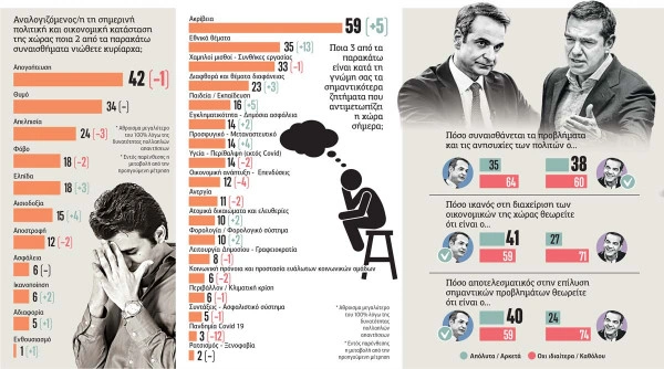 Αξιοσημείωτο είναι, επίσης, το γεγονός ότι ενώ η πλειοψηφία (64%) των ερωτηθέντων κρίνει πως ο Κυριάκος Μητσοτάκης δεν συναισθάνεται ιδιαίτερα/καθόλου τα προβλήματα και τις ανησυχίες των πολιτών – πολύ κοντά σε ποσοστό βρίσκεται και ο Αλέξης Τσίπρας σε αυτό το ερώτημα, με 60% αρνητικές απόψεις – οι περισσότεροι απάντησαν ότι εμπιστεύονται περισσότερο τον πρωθυπουργό στη διαχείριση των οικονομικών της χώρας – ποσοστό 41% έναντι 27% για τον Αλέξη Τσίπρα. Επιπλέον, η πλειοψηφία θεωρεί πιο αποτελεσματικό στην επίλυση σημαντικών προβλημάτων τον Κυριάκο Μητσοτάκη (40%), έναντι του προέδρου του ΣΥΡΙΖΑ (24%).