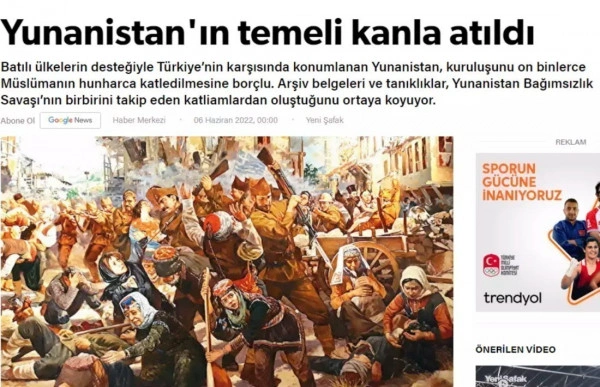 Την ίδια ώρα, η εφημερίδα Γενί Σαφάκ μιλά για τις διαδοχικές σφαγές που έκαναν οι Έλληνες κατά την Ελληνική Επανάσταση. Το δημοσίευμα επικαλείται θέσεις του γνωστού Βρετανού ιστορικού Γουίλιαμ Σαίντ Κλερ για την μάχη της Τριπολιτσάς: «Η Ελλάδα που στέκεται απέναντι στην Τουρκία με την υποστήριξη των δυτικών χωρών, οφείλει την ίδρυση της στη βάναυση δολοφονία δεκάδων χιλιάδων μουσουλμάνων. Ιστορικά αρχεία, έγγραφα και μαρτυρίες αποκαλύπτουν ότι η Ελληνική Επανάσταση ήταν μια σειρά από διαδοχικές σφαγές». Στη συνέχεια το δημοσίευμα καταφέρεται κατά της Κύπρου, του Μακαρίου και του κλήρου: «Η συνεχώς κλιμακούμενη εχθρική στάση, τις τελευταίες εβδομάδες που έχει υιοθετήσει η Ελλάδα έναντι της Τουρκίας, απέκτησε νέα διάσταση με τον υπαινιγμό του πρωθυπουργού Κυριάκου Μητσοτάκη ότι ''το ΝΑΤΟ είναι στο πλευρό μας στις εντάσεις με την Τουρκία''».