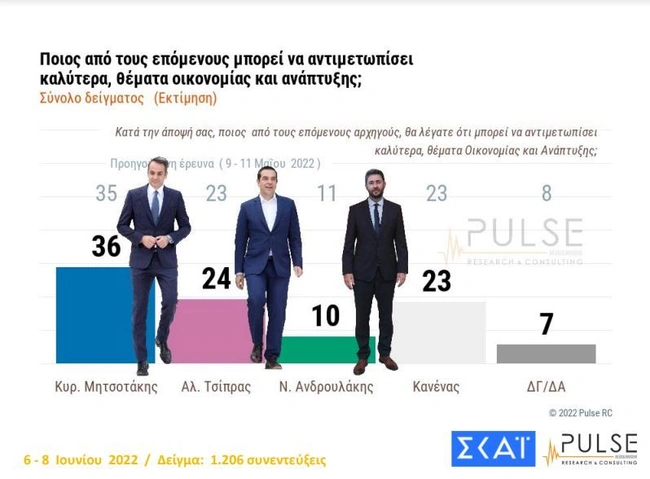 Ο Κυριάκος Μητσοτάκης προηγείται και στο ερώτημα «ποιος από τους επόμενους μπορεί να αντιμετωπίσει καλύτερα θέματα οικονομίας;». Συγκεκριμένα, ο πρωθυπουργός συγκεντρώνει 36%, ο Αλέξης Τσίπρας 24%, ο Νίκος Ανδρουλάκης 10% και «κανένας» 23%.